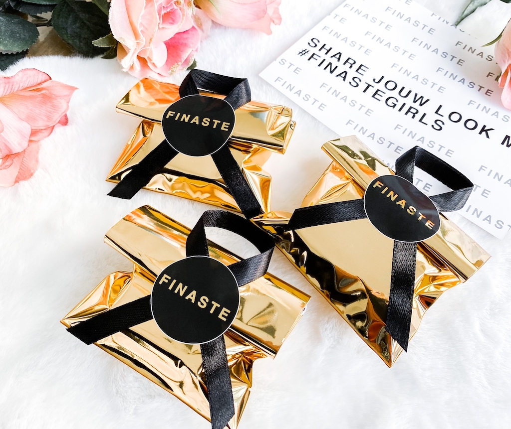 Alle sieraden zijn verpakt in glanzende gouden folie zakjes. Met op de bovenkant een zwart lint en een sticker het logo van Finaste. Het oogt chique en het ziet er prachtig uit om op deze manier cadeau aan iemand te geven. Heel mooi gedaan!